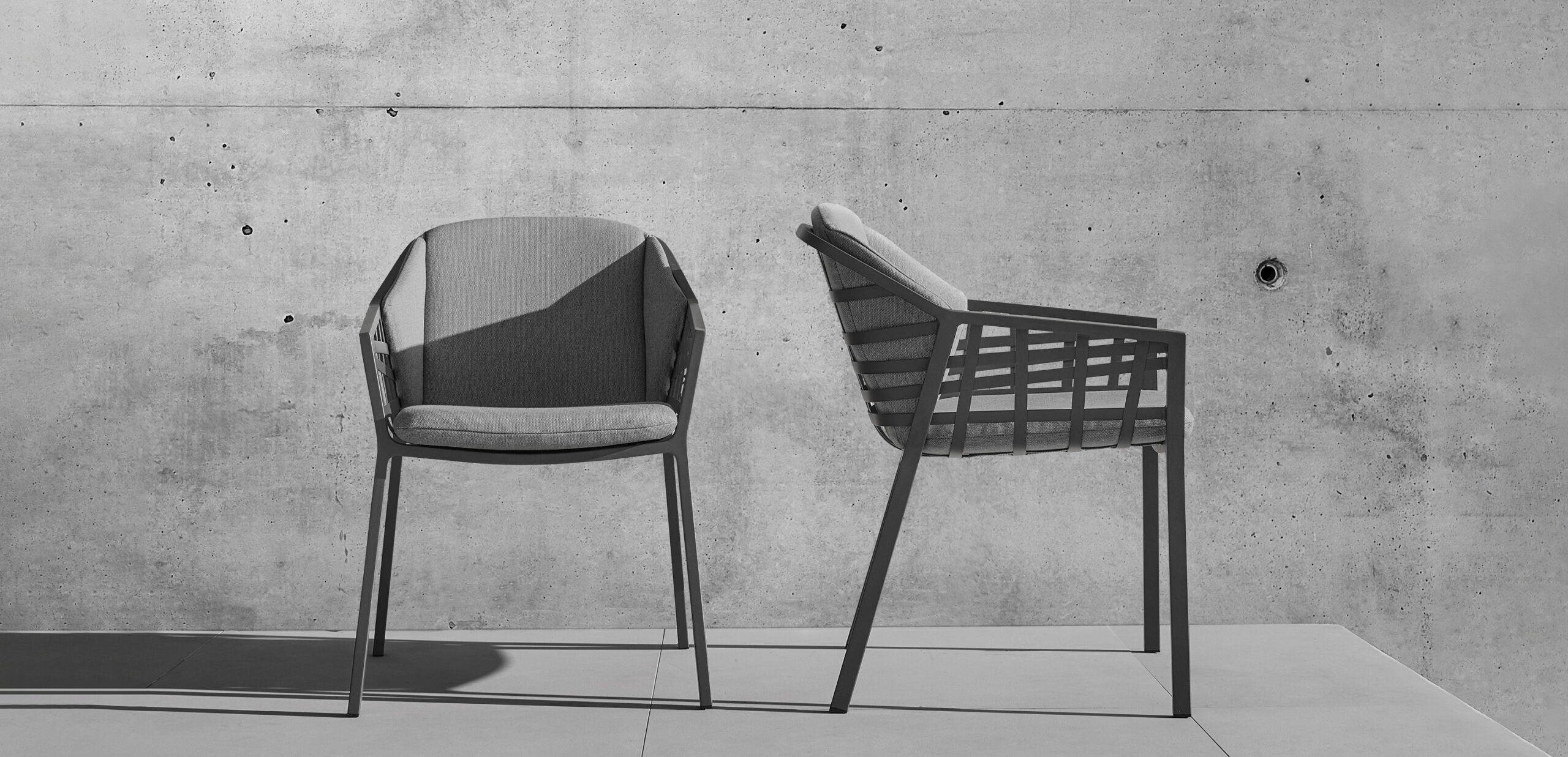 BASKET makes a great visual impact with its semi-transparent seat shell consisting of an airy, lightweight construction of irregularly arranged aluminium bands. With its ergonomic design, both supreme support and a cocooning feel are guaranteed. Fully tailored, comfortable seat cushions, with open sides, add additional seating comfort.