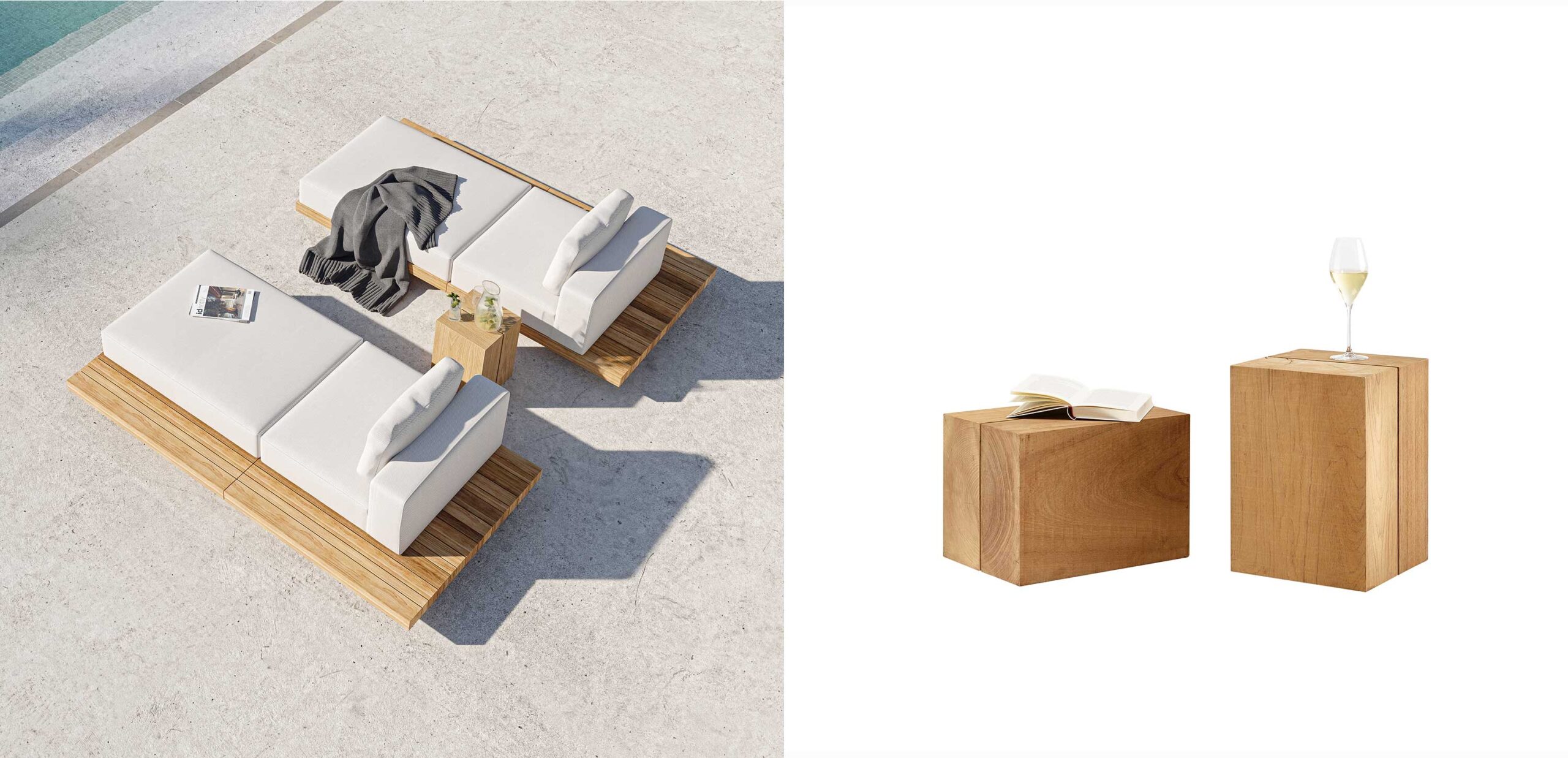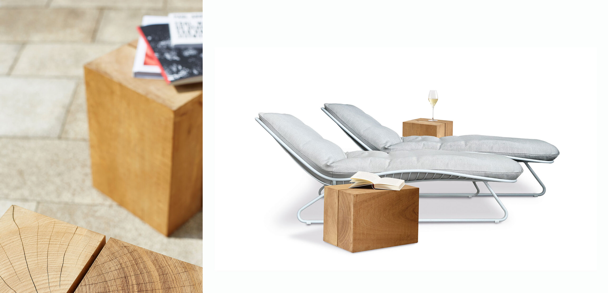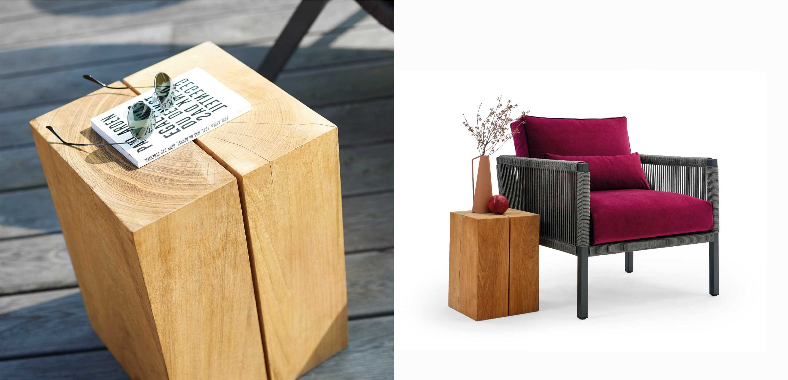 BLOCC is a cubic block consisting of two solid teak halves. Each cube is unique and lives from its natural grain. BLOCC is versatile and can be used as a side table, shelf or occasional seating – making it the perfect match for any outdoor setting.