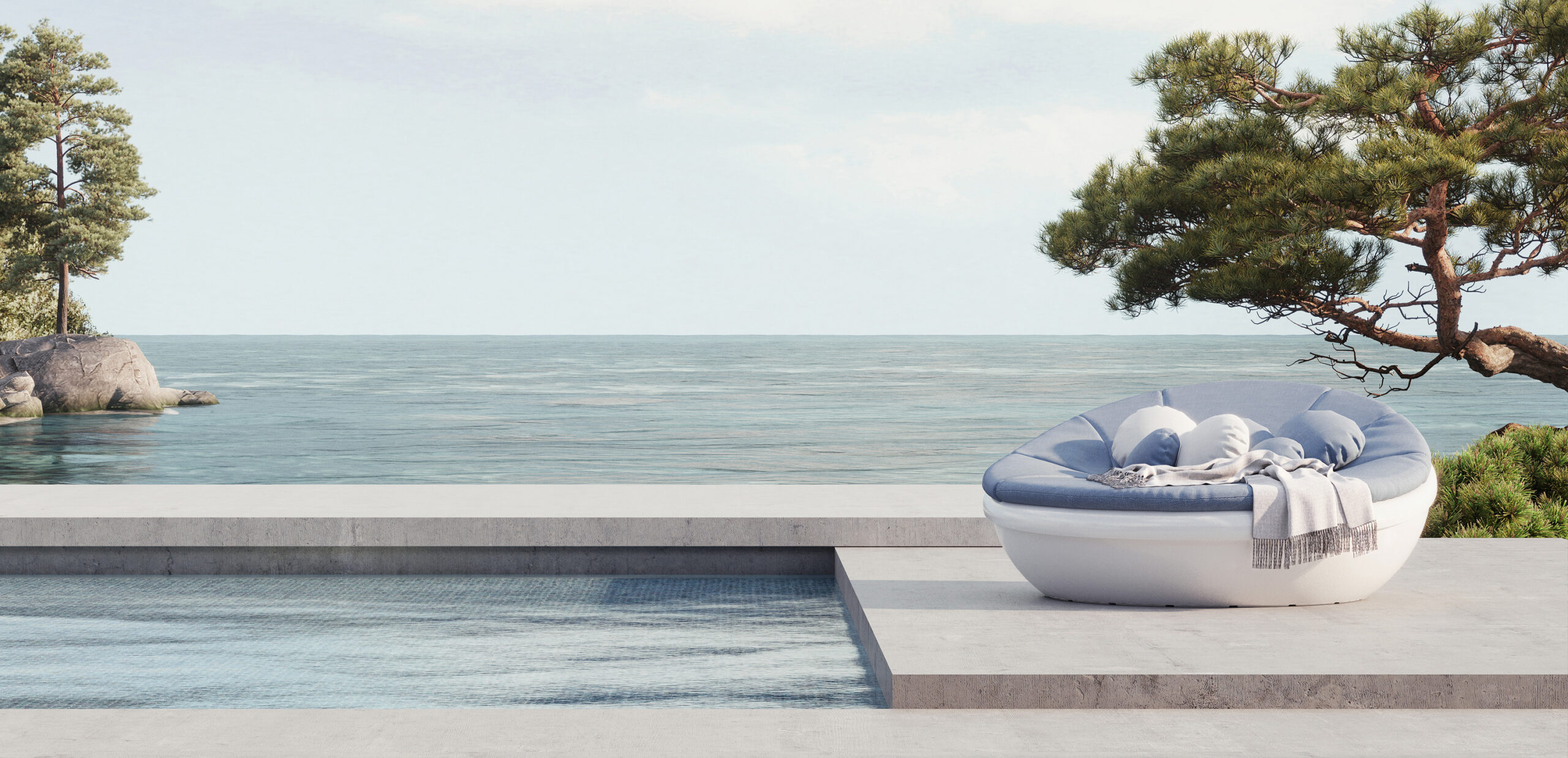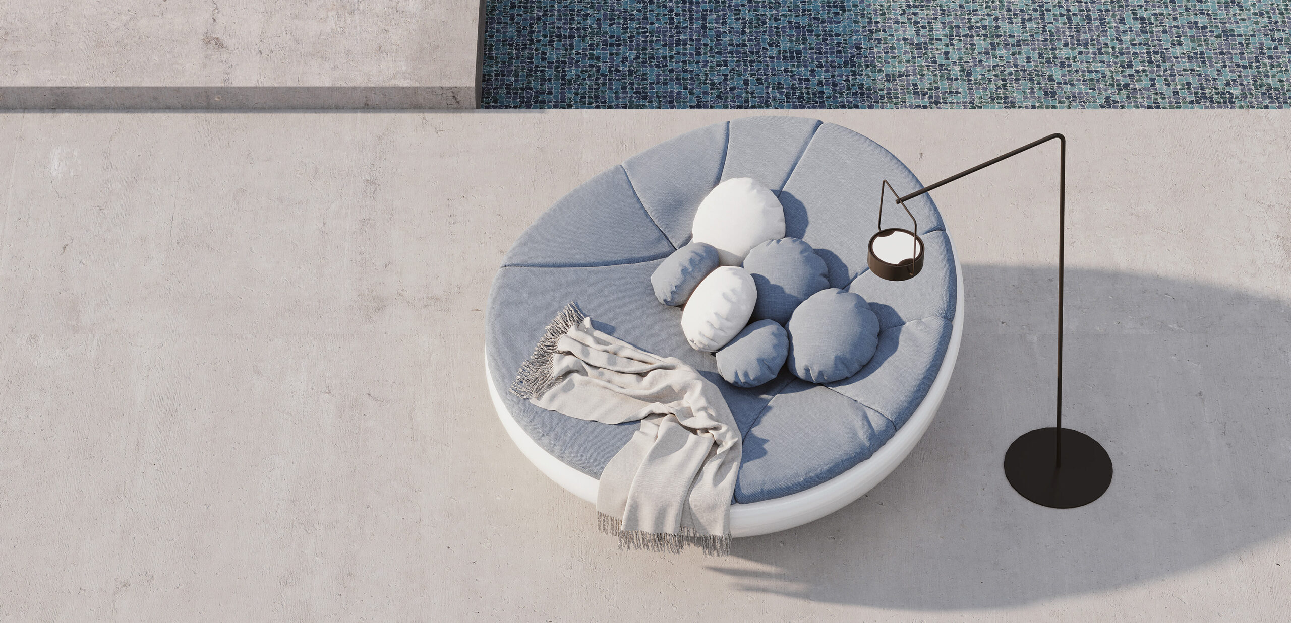 LAGOON – the daybed for the whole family. 2 metres in diameter, made of rotation-sintered polyethylene. Absolutely weatherproof with integrated water run-off and removable upholstery. The sun sail can provide shade all day long, following the course of the sun, or be moved completely to one side. Extra equipment: LED lighting, smooth daybed rotation on rollers.
