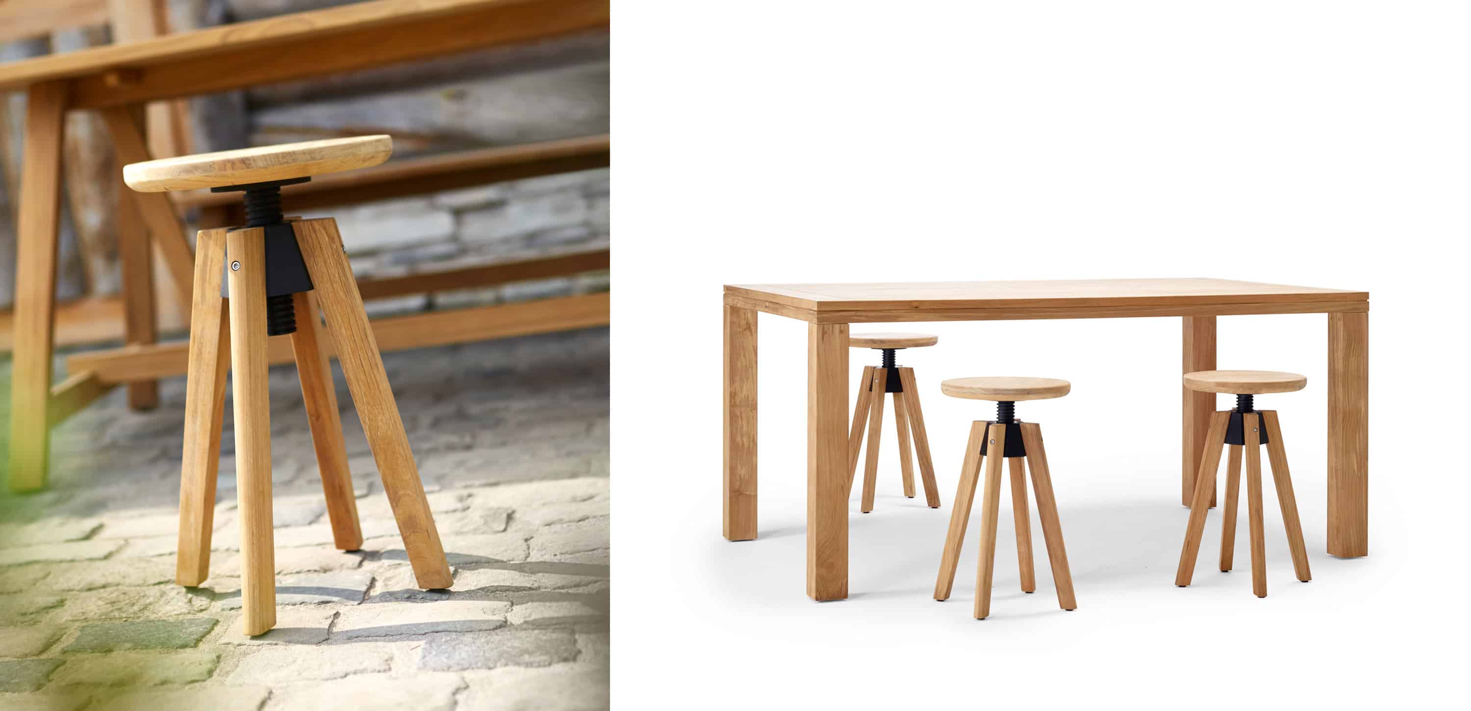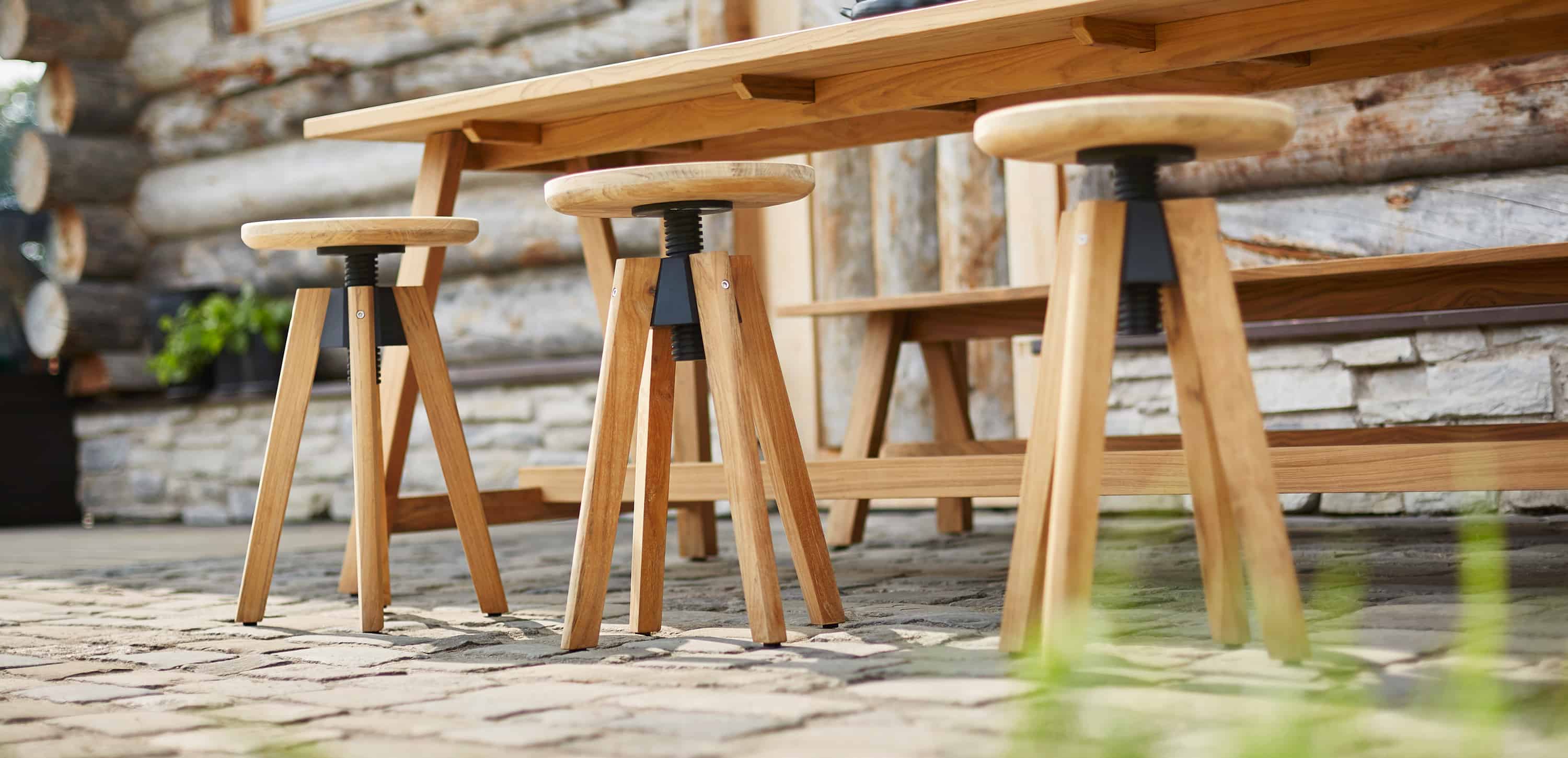 SPINDLE swivel stool made of teak – simple, elegant, functional. Four teak legs carry the solid threaded sleeve made of cast aluminium. The seat is formed by a teak plate and can be easily rotated to the desired seat height.