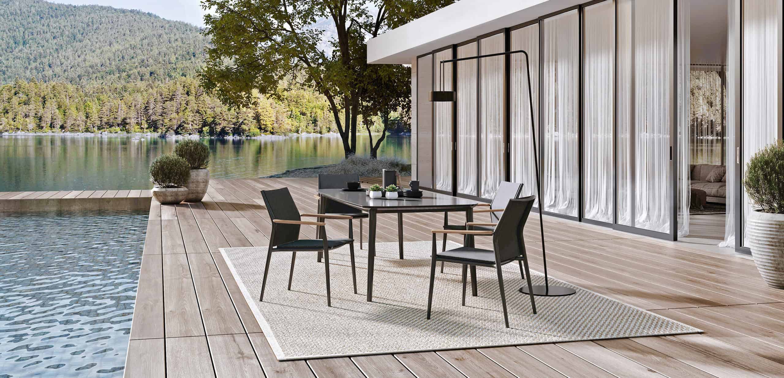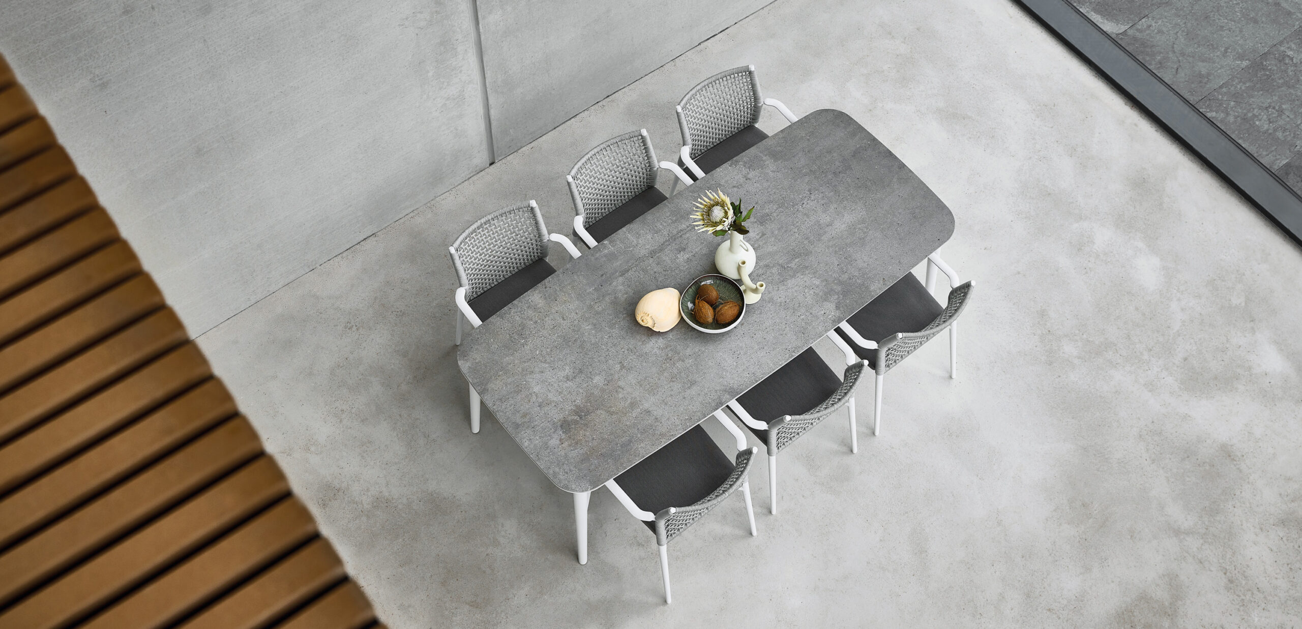 The CHARLIE table is characterised by a soft appearance, which results from the combination of well-proportioned, tapered legs and the gently rounded boat shape of the table top. The powder-coated aluminium frame is available in Anthracite, White and Petrol. Together with the table tops, which are available in various Dekton or ceramic tops and even a teak top, interesting colour combinations can be created to meet individual preferences.