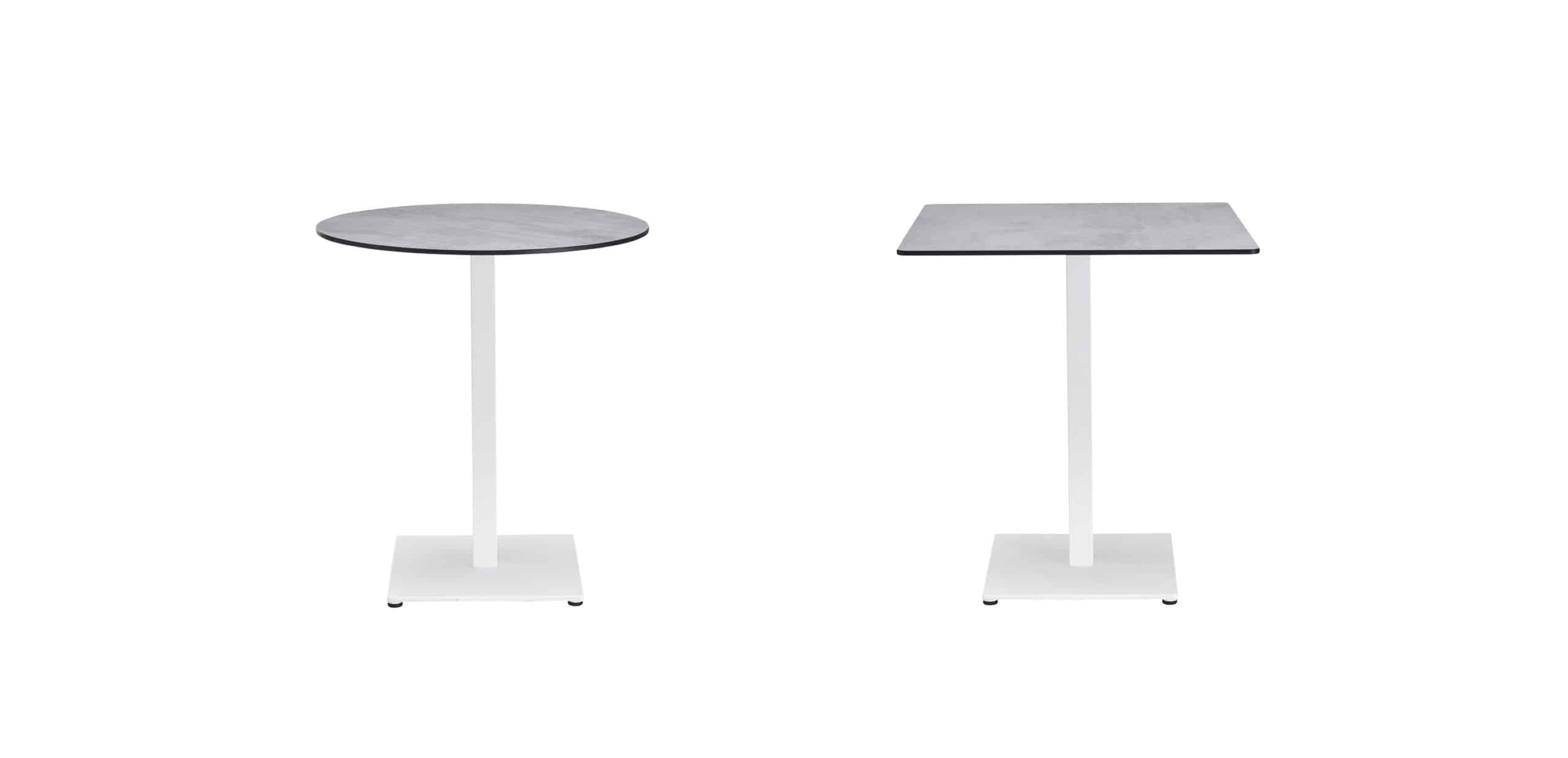 The classic design of the PARIS bistro table is characterised by a central plinth with a square base plate. The table top is available in a round (Ø 70 cm) or square version (70 cm x 70 cm) with a choice of different robust HPL-3D surfaces.