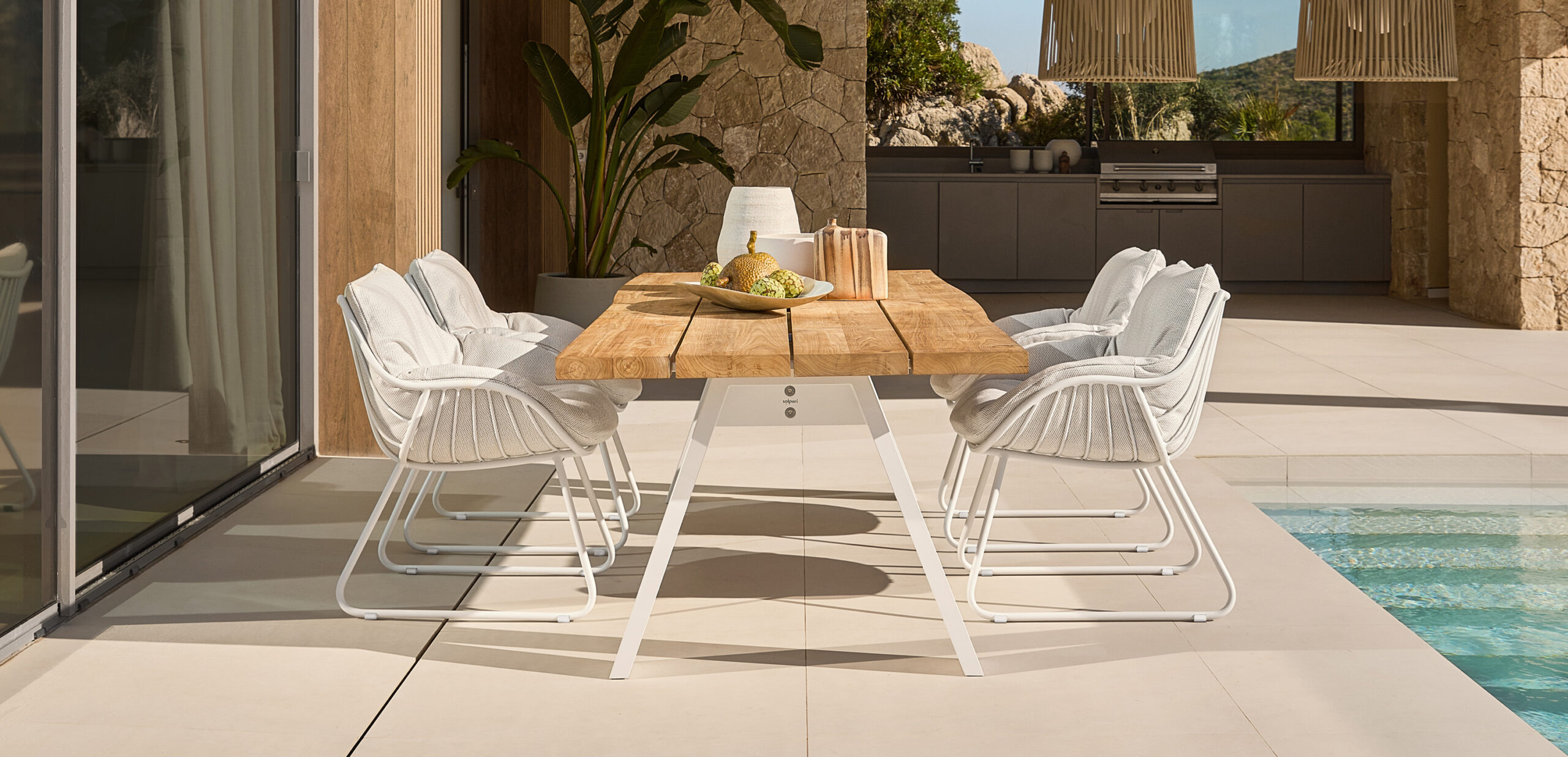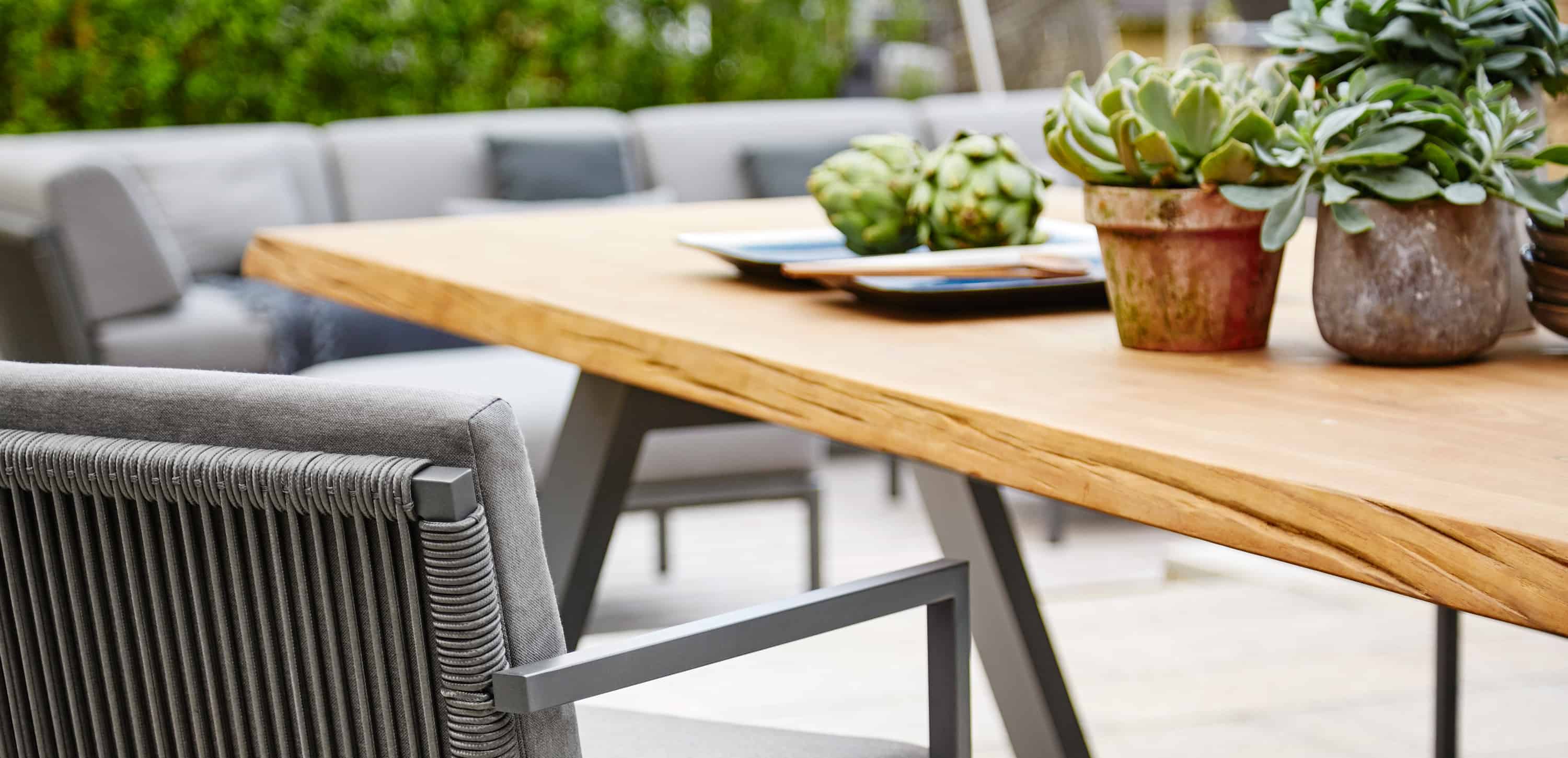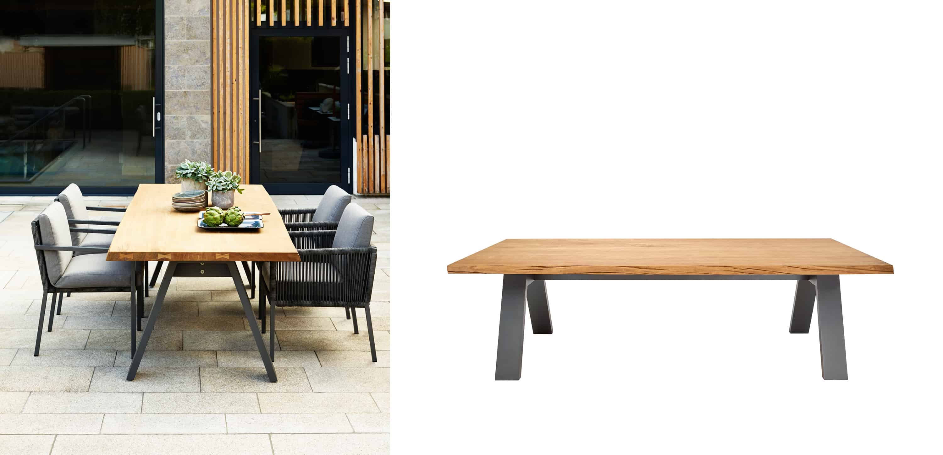 TIMBER’s distinctive features are the outer edges of the solid teak top which are left in the natural shape of a tree and sturdy aluminium legs in an inverted V-shape construction to support the table top. Each TIMBER table top is one-of-a-kind, with individual grain patterns and natural contour edges, and lives from its beautiful patina.