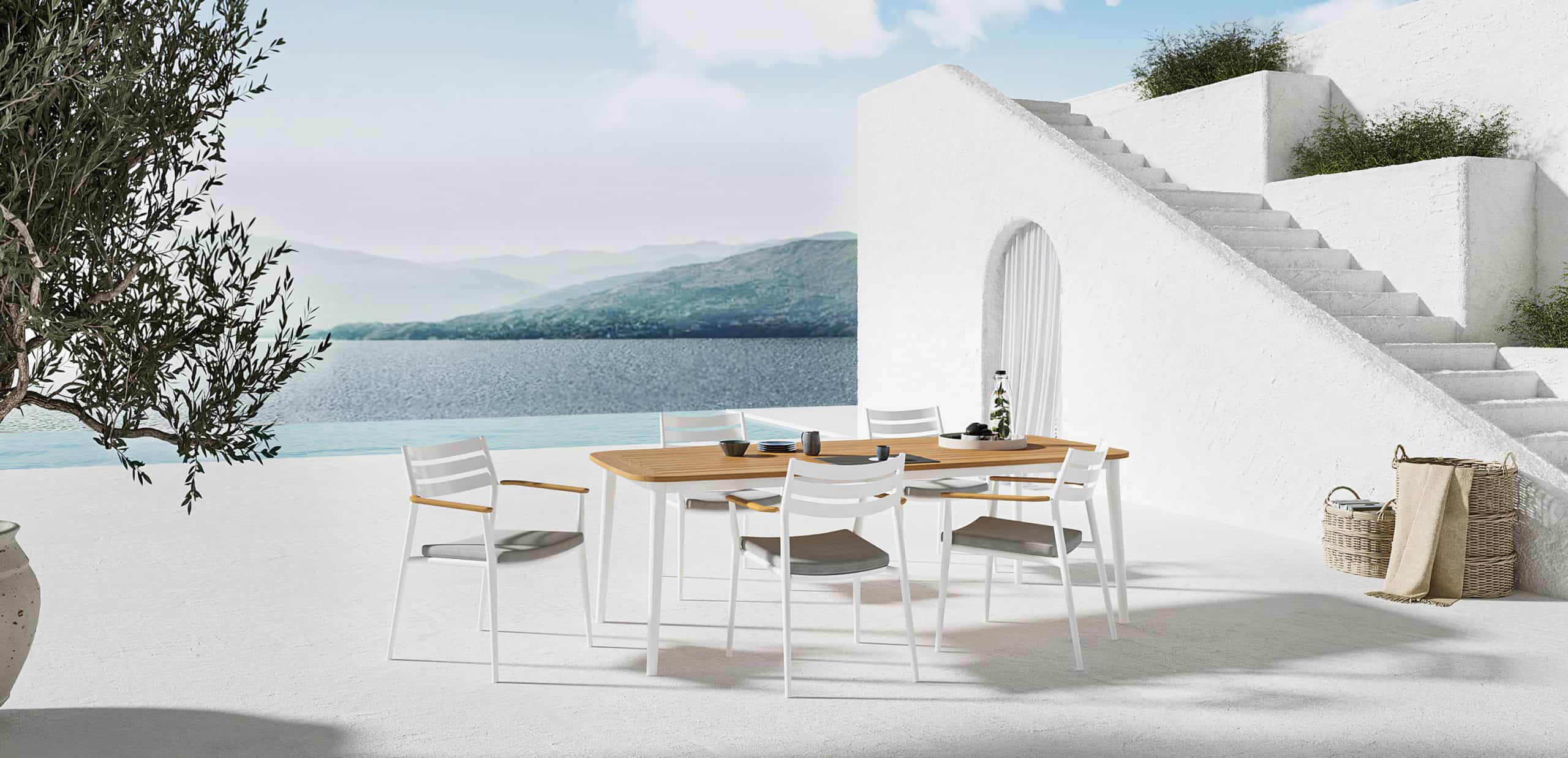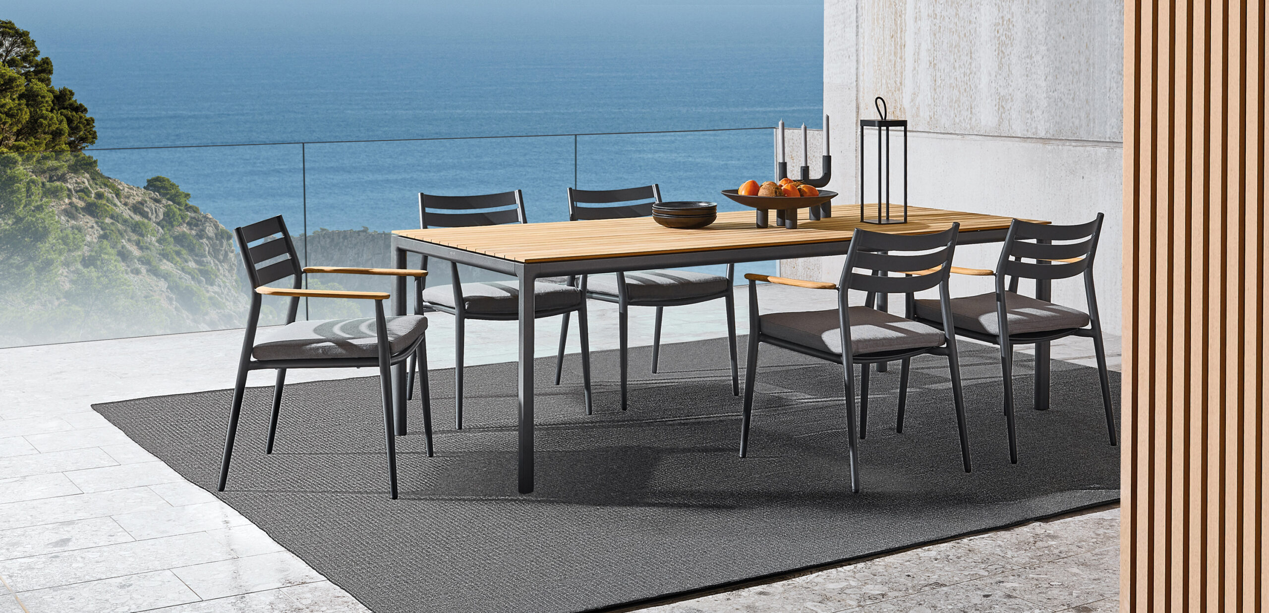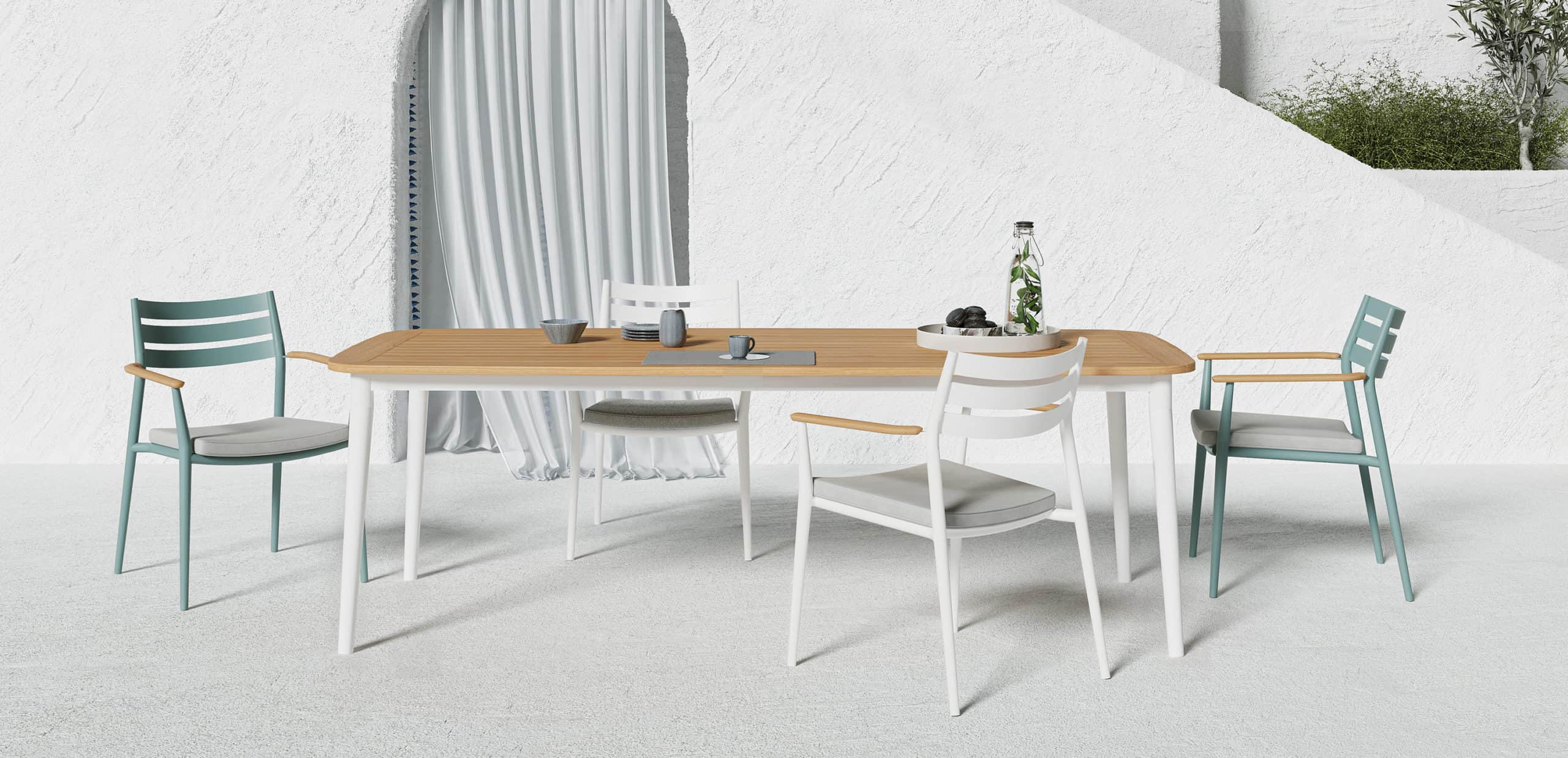 Das markante Gestaltungsmerkmal des modernen Stapelstuhls PIA sind seine sich elegant verjüngenden Beine, die eine Sitzschale aus Aluminium tragen. Einen schönen Kontrast hierzu bilden die Armlehnen aus Teak, die nicht nur optisch Wärme verleihen, sondern auch beim Berühren ein angenehm warmes und sanftes Gefühl vermitteln.