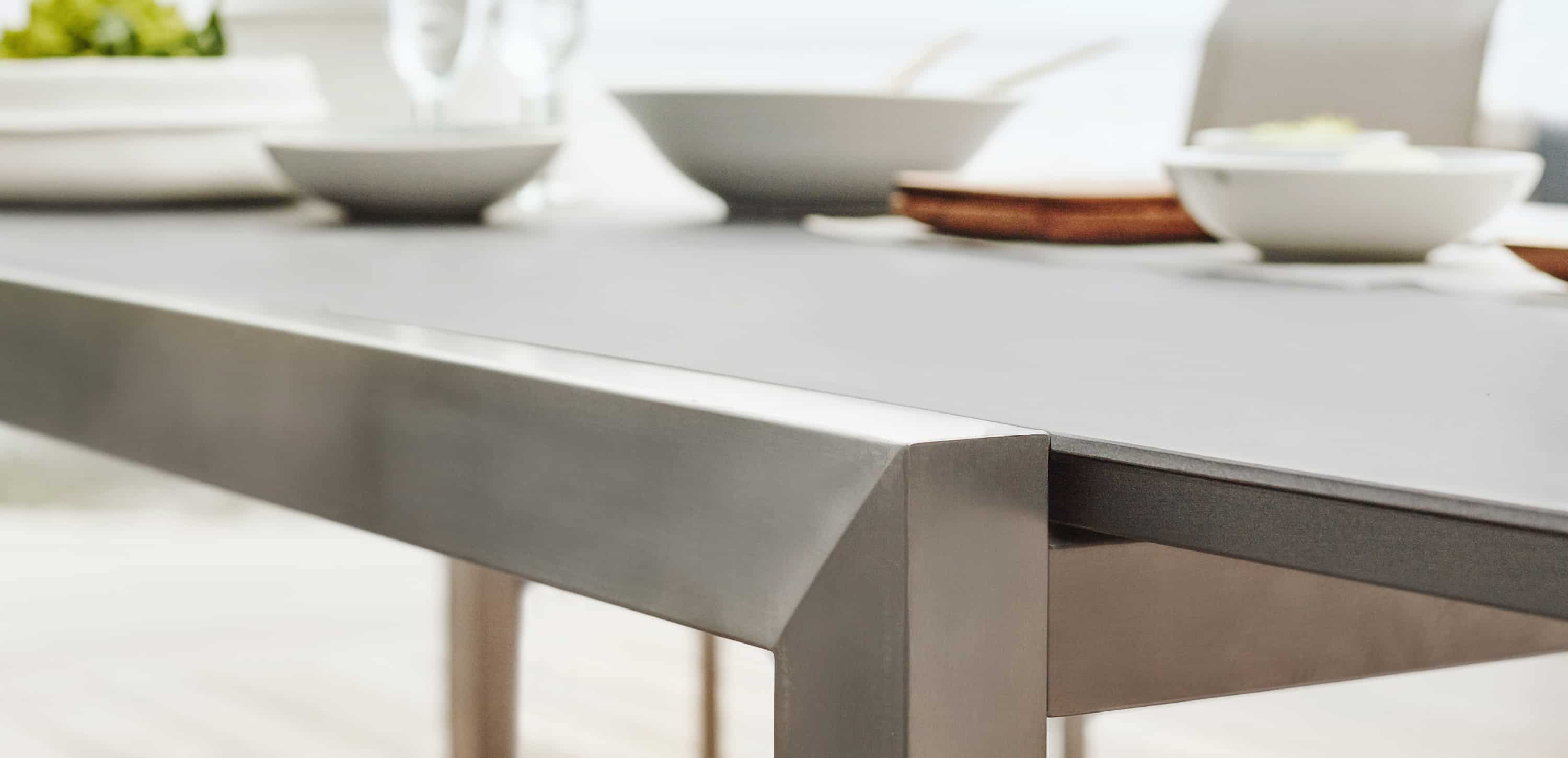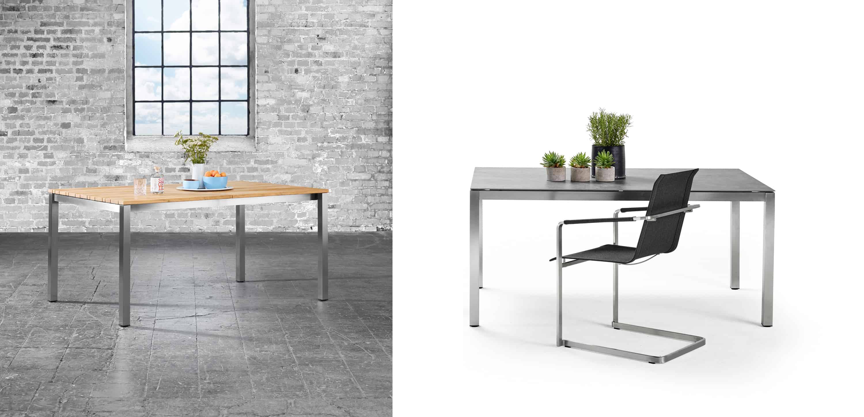 Tischserie CLASSIC – der Name ist Programm. Das geradlinige Edelstahl-Tischgestell aus quadratischen Vierkantprofilen verleiht dem Tisch sein klassisch zeitloses Design. Die hochwertige Tischplatte – wahlweise aus Keramik, Teak oder HPL – erzeugt eine unvergleichbare optische Eleganz.