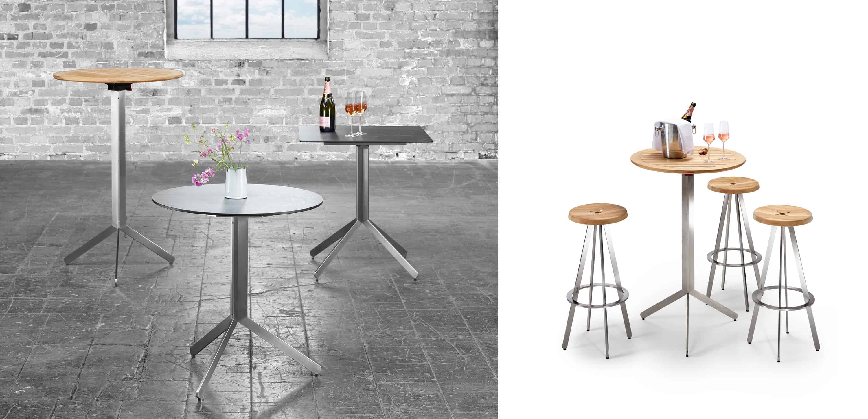 YIX Klapptische – pures Design gepaart mit Funktion. Geprägt ist das Design durch einen Mittelfuss aus dessen Rippen sich die Füße förmlich herausfalten. Ein hochwertiger Klappmechanismus erlaubt das Wegklappen der robusten Tischplatte – wahlweise aus HPL, Teak oder Keramik.
